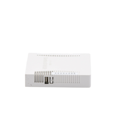 hEX PoE es un router Gigabit Ethernet de cinco puertos para lugares donde no se requiere conectividad inalámbrica. El dispositivo tiene un puerto USB 2.0 y un puerto SFP para la adición de conectividad de fibra óptica. Los puertos 2-5 pueden alimentar otros dispositivos capaces de PoE con la misma tensión que se aplica a la unidad.
